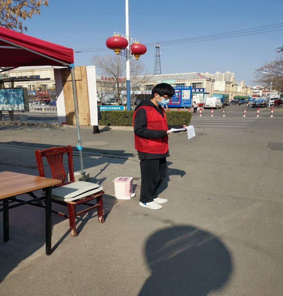 学生2016级学生王思贤深知自己作为学生党员的责任,主动请缨赴莒南县板泉镇集下村开展疫情排查工作。主要负责统计春节外地返乡村民、年后村口值班、参与村主干道消毒、走访村民排查去往武汉、湖北等地人员等工作。王思贤表示,国难当头,吾辈应勇担责任。作为一名中国人,更作为一名党员,在国家人民需要的时刻应该身先士卒,冲在前头。“这是我的责任,更是人民赋予我的使命”王思贤如是说。