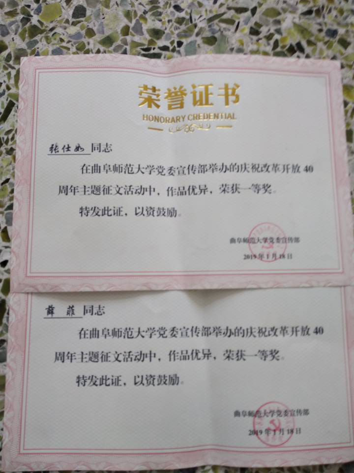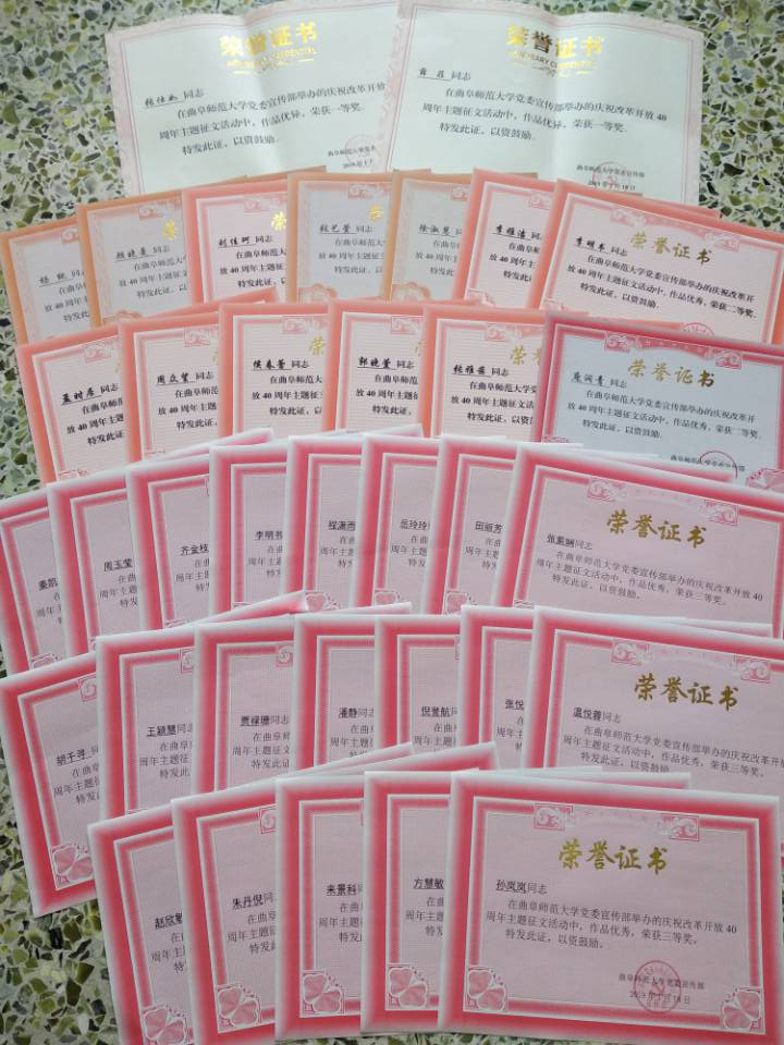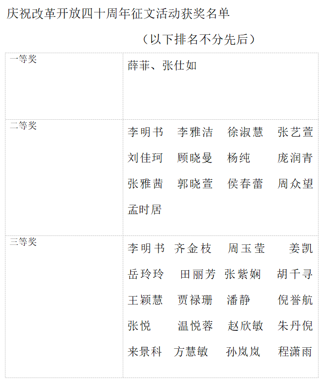评审,薛菲、张仕如2人荣获一等奖,李明书、李雅洁等13名同学荣获二等奖,齐金枝、周玉莹等20名同学获得三等奖,他们在本次征文活动中真情流入、有感而发,其他参赛同学同样笔下生花。所有参赛者都将自己心中的曲园复兴与对改革开放的展望描绘尽致。
