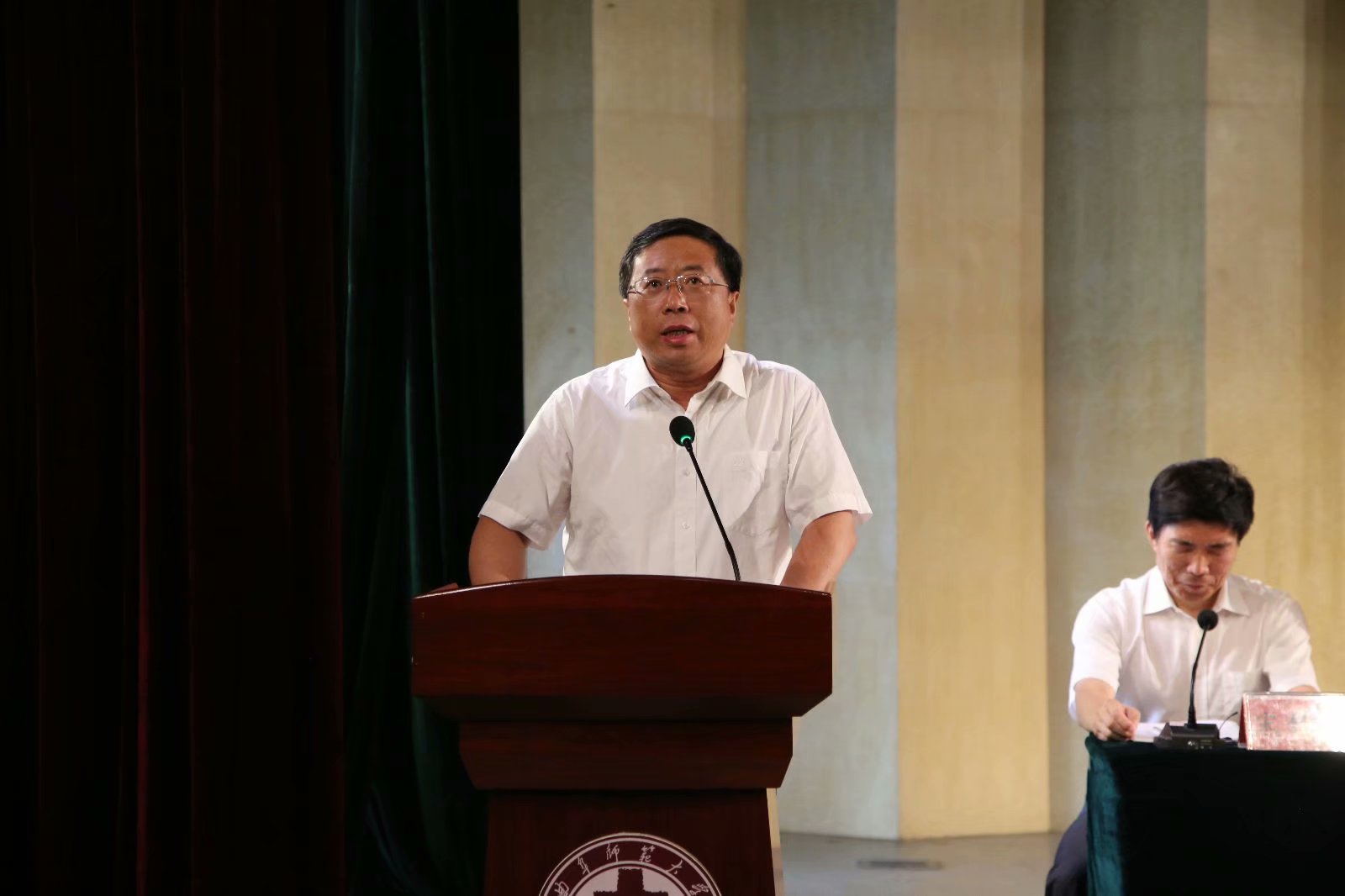 典礼于庄严的国歌声中拉开帷幕。王维先教授首先为典礼致辞,他与毕业生们共同回忆大学校园生活,字正腔圆的谈吐里是与同学们经历的难忘岁月,字里行间中透露出对同学们离开的不舍。他声声叮嘱如黄钟大吕,让同学们时刻牢记“善良”与“正直”的价值,并表达对同学们未来光明前景的祝愿。