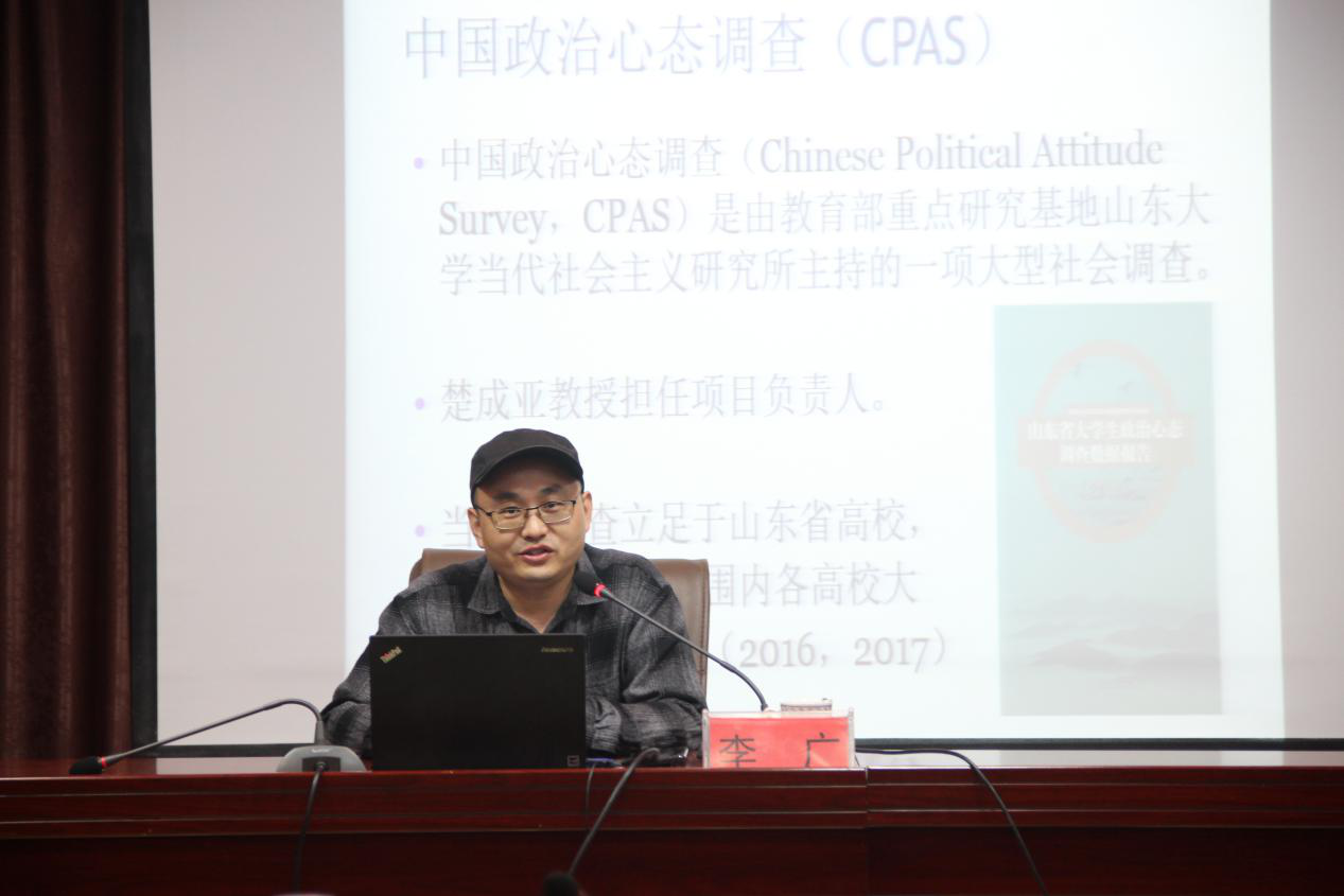 李广副教授表示,CPAS指中国政治心态调查,是由教育部重点研究基地山东大学当代社会主义研究所主持的一项大型社会调查。本次调查采用了基于概率抽样的问卷调查法,随机抽取了4162名本科生,抽样采用了分层抽样和整群抽样相结合的方法。问卷结构包括个人信息、政治心理卷入强度、民族主义、民主信念、政治支持、治国理念偏好和公正世界信念等七个方面。其中,政治心理卷入是指大学生对政治的关心程度和认知程度、政治参与的心理意愿,在行为上常常表现为政治讨论;民主信念是指对于民主信念的态度,包括两个量表和四个问题,即对民主认可的程度;公正世界信念是人格心理学和社会心理学中的一个重要概念,它指的是这个世界是公正的,在这个公正的世界里,人们得其所应得,所得即应得。这种信念被看做一种基本的错觉,是与基本归因错误有关的归因偏差。李广副教授用详实的数据、丰富的例子为在场的同学们做了一场精彩至极的讲座。在讲座互动环节,李广副教授详实回答学生所提相关问题,同学们纷纷表示获益匪浅。