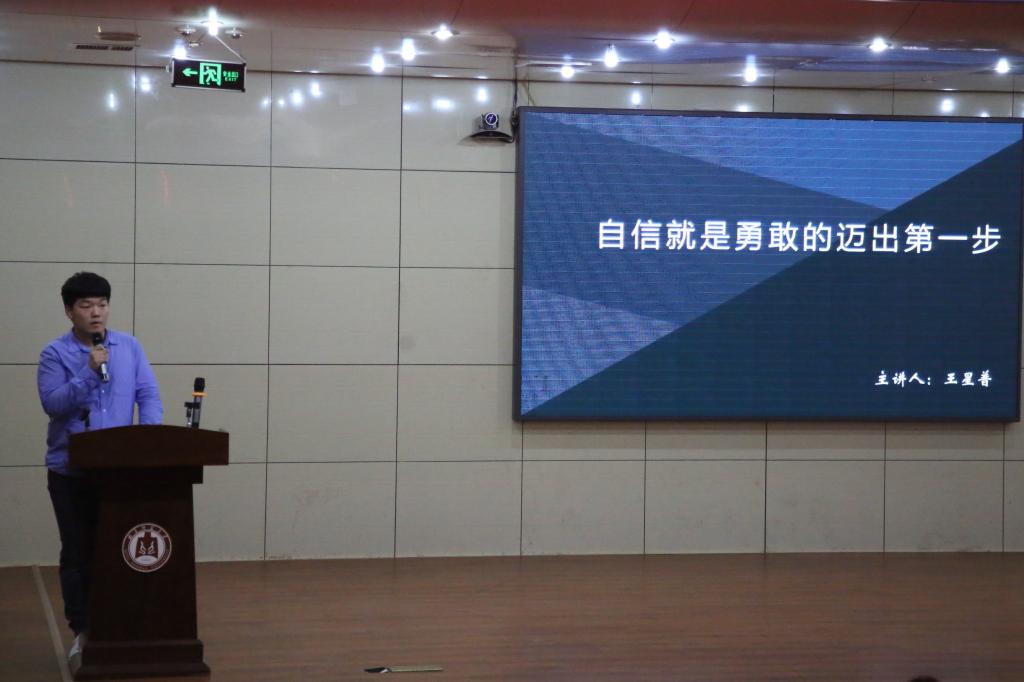 在第二部分,王思贤以“青年人生,吾辈应担当”为题,通过焦裕禄的例子为同学们讲述榜样的力量,强调“青春有理想、有活力、有奋斗、有担当,是中国精神和中国力量的生命所在”。最后,王星普围绕“自信就是勇敢迈出的第一步”,分析现代人自信缺失的原因,他列举了雷军的创业经历以及自己成长各个阶段的对自信的认知、对自我的审视,以此鼓励同学们培养自信心让未来更美好。