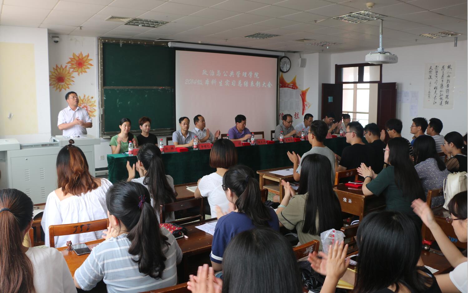 2014级本科生实习总结表彰大会于JC605举行。学部党委书记张立兴,院长王维先,学部党委副书记刘进,院长助理林士俊,哲学系主任赵昆,政治学与行政学系主任李增元,行政管理系主任徐自强,张蕊、张楠老师出席,大会由学部团委书记陈敏主持。