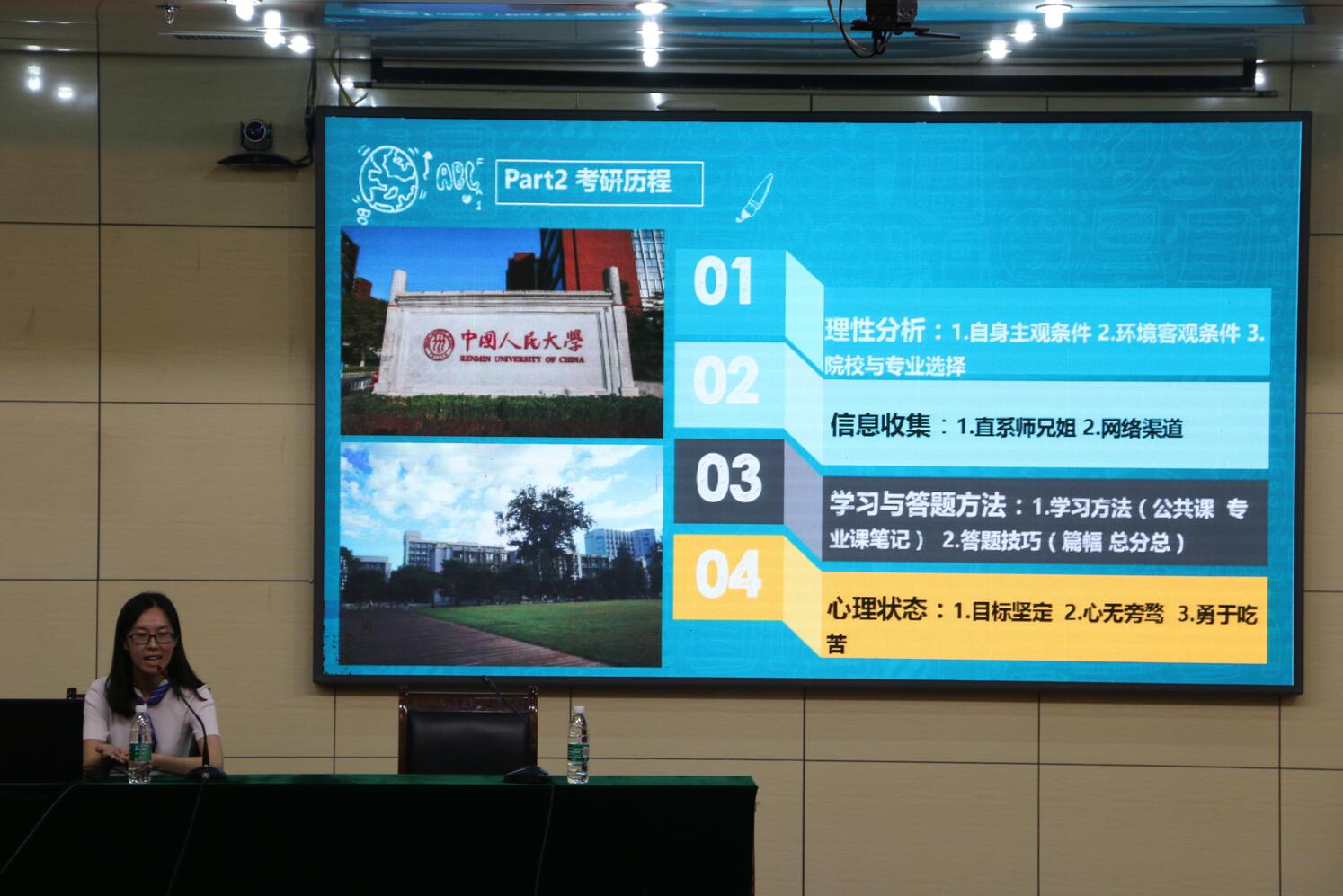 房颖同学首先以个人大学生活与考研历程为主题作 “逆风飞翔,不负勇往”的学习与考研经验交流,内容共分为三部分:大学生活、考研历程与政治学的学习。在大学生活部分,房颖就个人在学习、学生工作以及课外活动等方面所遇到的种种选择为切入点,指出大学生应尽早确立价值目标,多方涉猎、勇于挑战,从而达到全面发展。她向参会同学详细讲述了自己考取中国人民大学的学习历程与经验,并重点阐述政治学专业的学习方法,强调基础知识与文献并重,从“论文查找、论文分类、论文整理”三方面对文献的学习提出建议。