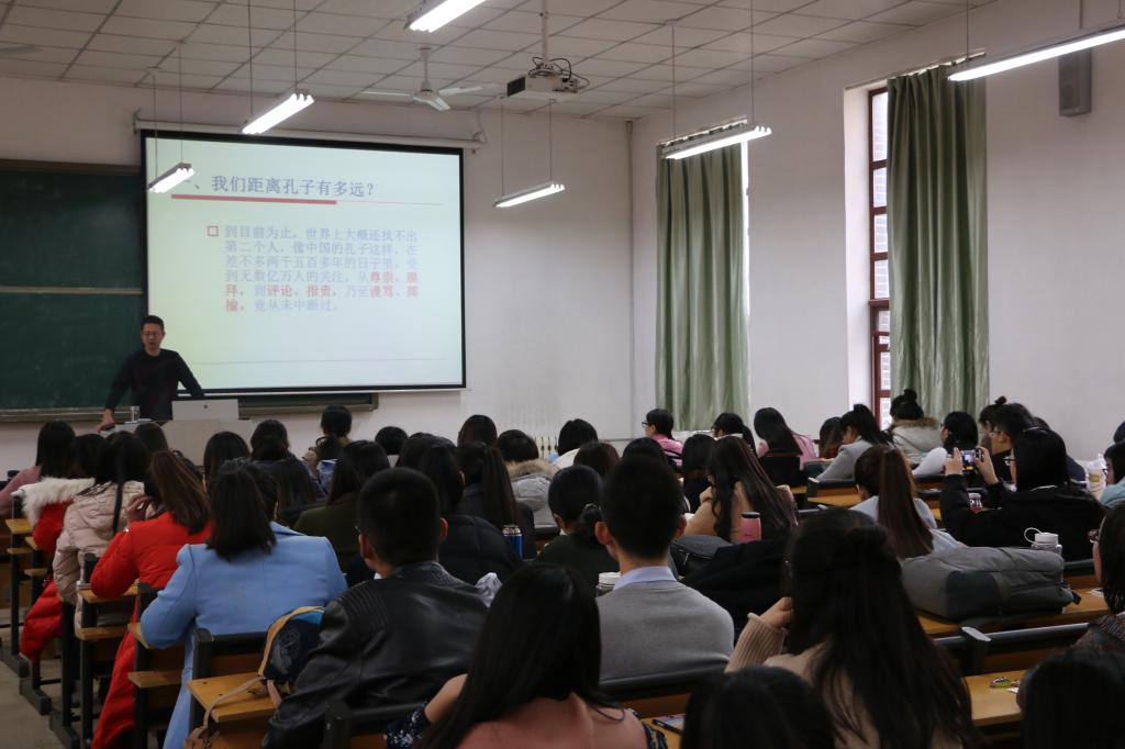 孔子与中国文化研究室主任、国学研究中心副主任、中国孔子研究院特聘教授宋立林博士就“孔子思想与儒学精髓”给同学们作了一场十分精彩的儒家文化讲座。讲座分为五大板块,宋立林博士以丰富深厚的学养,结合自己最新的研究成果,对圣城曲阜、圣人孔子、孔子与儒家文化、儒家思想的核心、儒家思想的当代价值等进行了深入浅出,旁征博引,风趣幽默的解读和阐发,使同学们对曲阜、孔子有了更深切的了解,增进了文化自信。