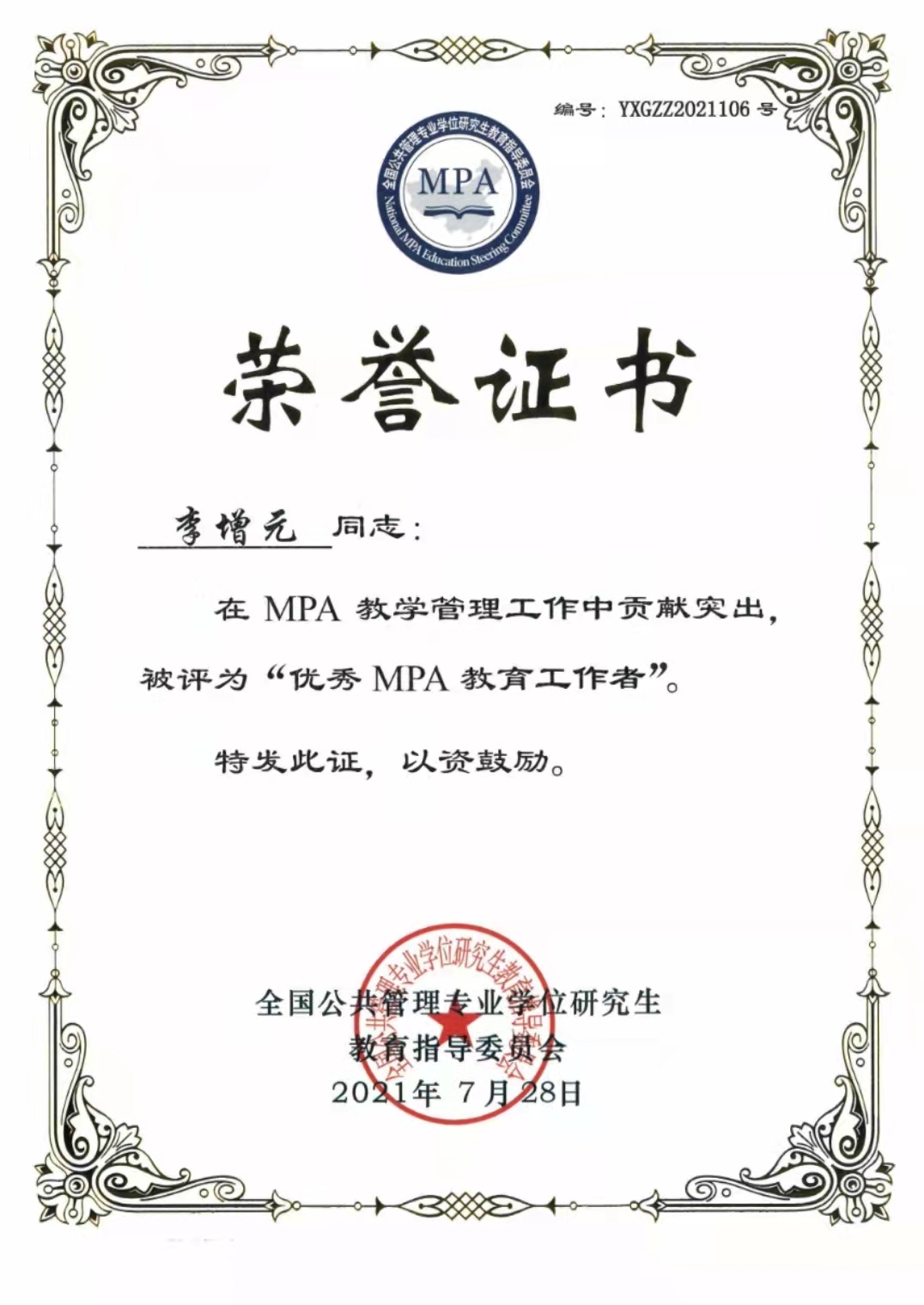林士俊副教授荣获“优秀MPA教师”荣誉称号,李增元教授荣获“优秀MPA教育工作者”荣誉称号。本次获奖,是对两位教师教学水平和工作能力的高度认可,两位教师多年来致力于MPA教育工作,全面贯彻党的教育方针,落实立德树人根本任务,在MPA教学管理中积极探索MPA教育理念和发展特点,为金沙娱乐
