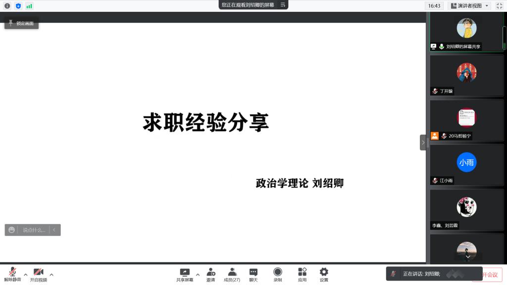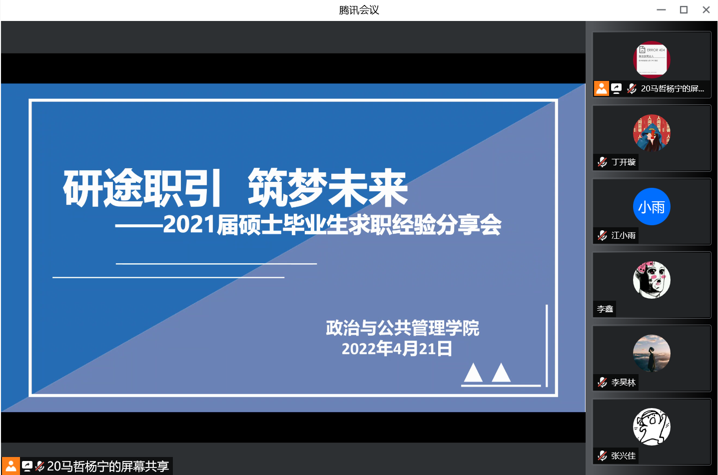 召开第二期“研途职引,筑梦未来”——2021届硕士毕业生求职经验分享会,本次会议邀请2021届优秀硕士毕业生刘绍卿、刘喆、韩熠琳、李昊林围绕“事业单位类”岗位招聘分享个人求职经验,会议由研究生辅导员徐莉主持,金沙娱乐