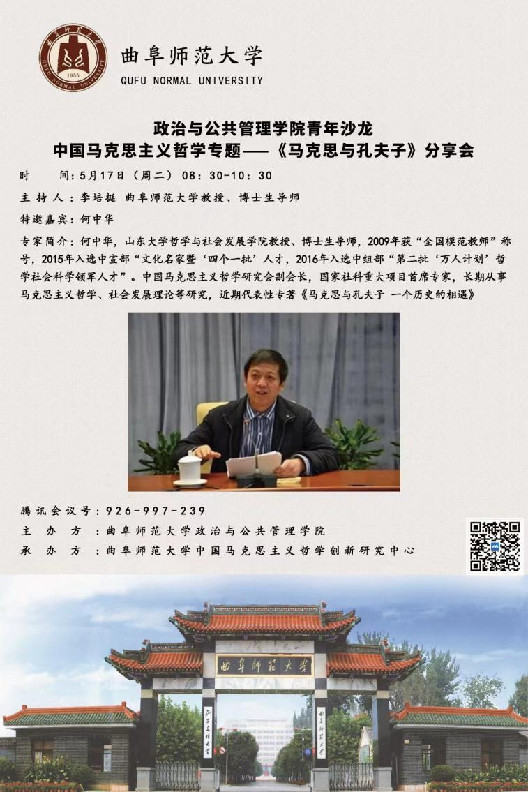 为进一步创新学术研讨模式激活青年师生学术兴趣政治与金沙娱乐 引入青年沙龙学术研讨模式。在金沙娱乐 主要领导的大力支持下,于5月17日上午8:30-10:30线上召开了首期青年沙龙“中国马克思主义哲学专题——《马克思与孔夫子》学术分享会”。本次分享会特邀嘉宾是山东大学哲学与社会发展金沙娱乐 何中华教授,此次活动由金沙娱乐 学科办主任刘伟教授在线指导、孙功进老师点评、李培挺老师主持,李永刚、孟祥兴、刘祥乐、陈碧强、封顺帆、赵松等6位青年教师与院内外师友180人参加。