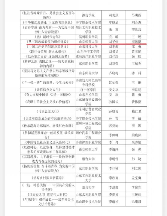选送的作品《从三湾改编中看组织建设》(团队成员:刘子恒、刘佳利、邵楷童、刘景玉、陆俊秀、倪振华、李三乐,指导教师:张玉飞、李培挺)喜获三等奖。