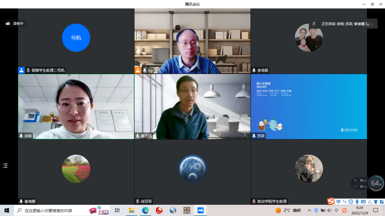 本次答辩会分为学位申请人汇报、答辩委员会成员提问、学位申请人答辩、答辩委员会评议、结果宣读五个部分。每位硕士研究生以ppt的形式,分别阐述论文选题背景、研究意义、研究方法、论文内容框架、论文创新点等内容。答辩委员会成员听取汇报后,逐一从论文摘要、理论基础、写作逻辑等方面进行细致点评,并对每一位学位申请人进行专业学术问题提问。随后,学位申请人按照提问顺序进行回答。紧张有序的答辩环节结束后,答辩会休会,各组答辩委员会经过评议和无记名投票表决进行论文等级评定和确定答辩结果。最后,答辩主席宣布答辩决议和投票结果,学生致谢并与答辩专家线上合影。