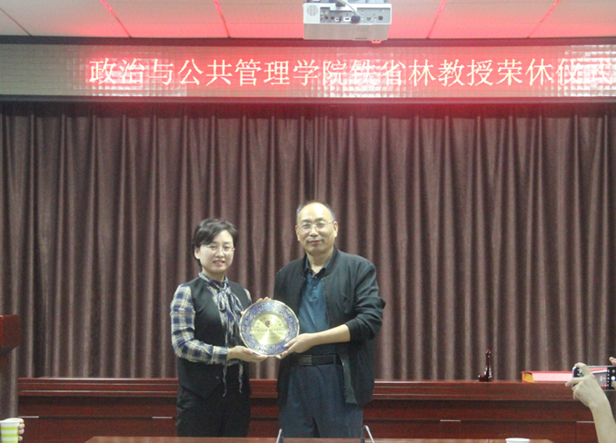 党委书记卢瑞霞为铁省林教授颁发荣休纪念品
