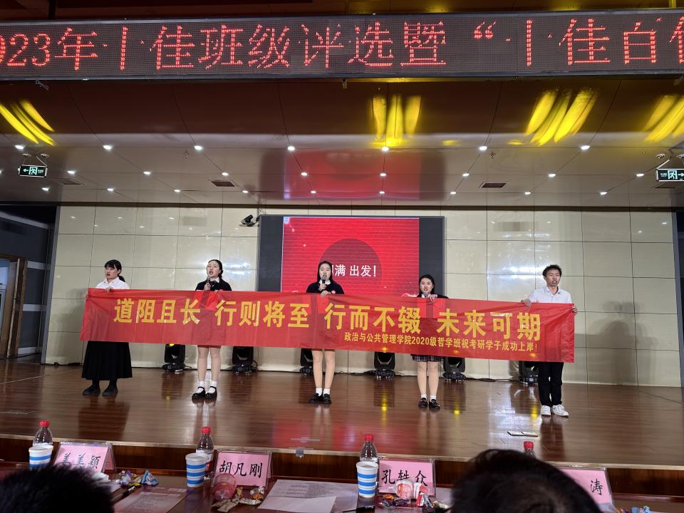 2020级、2021级哲学两个班通过过VCR、舞台剧、诗歌朗诵等多种形式展示班级丰硕成果。2020级哲学班通过《圆满,出发》的朗诵节目,声情并茂展示2020级四年来曲折的求学历程,并为全体2020级考研同学送出“道阻且长,行则将至,行而不辍,未来可期”真诚祝福。