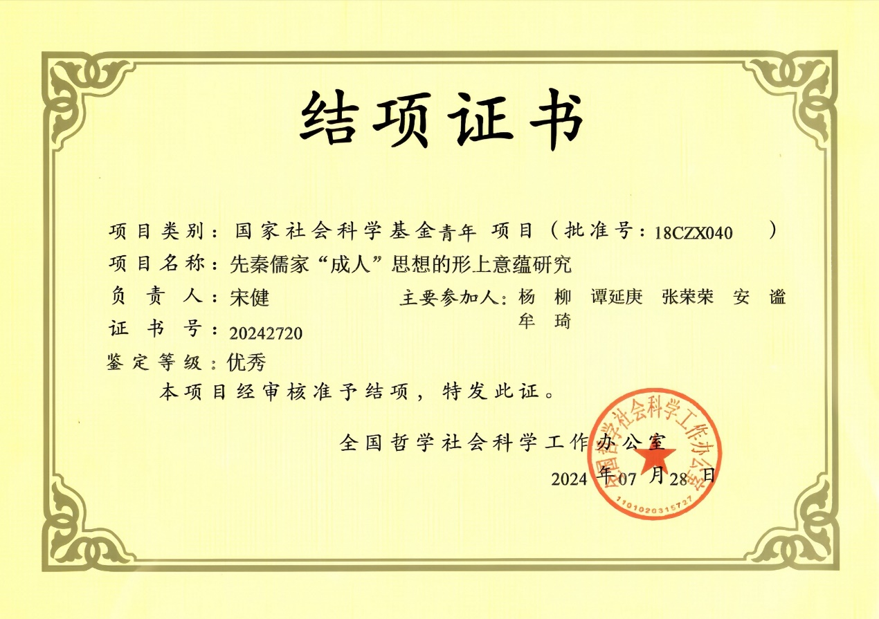 “泰山学者”青年专家宋健副教授主持完成的国家社科基金青年项目“先秦儒家‘成人’思想的形上意蕴研究”(批准号:18CZX040),2018年6月立项,2024年3月结项。项目成果形式为专著,结项等级为优秀(证书号:20242720)。课题组主要成员:杨柳、谭延庚、张荣荣、安谧、牟琦。