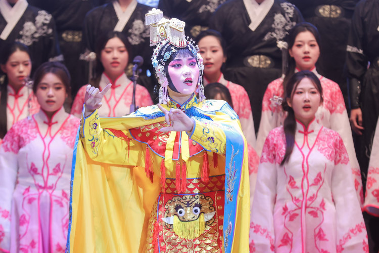 为了呈现最佳表演效果,金沙娱乐 合唱团的同学们付出了大量心血。从歌曲编排到声部磨合,从京剧身段训练到情感表达拿捏,大家利用课余时间反复打磨细节,克服了诸多挑战。指导老师全程悉心指导,从发声技巧、队形设计到服装道具搭配都严格把关,团队成员们相互鼓励、默契配合,在一次次排练中凝聚起强大的向心力。